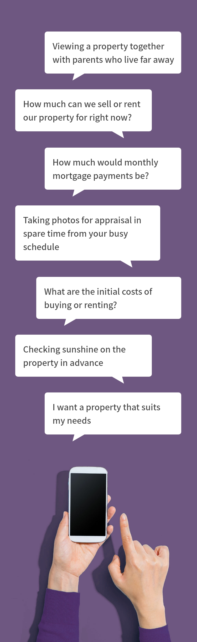 お忙しい方、手軽にさまざまな物件を内覧したい方、お急ぎで不動産査定をご希望される方など、